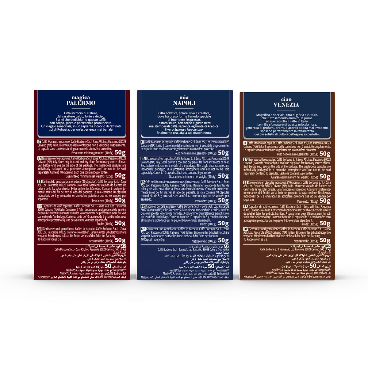 Cada paquete contiene 100 cápsulas de aluminio Caffè Borbone de los 3 blends disponibles: 40 cápsulas de la mezcla Mia Napoli, 30 cápsulas de la mezcla Magica Palermo y 30 cápsulas de la mezcla Ciao Venezia.