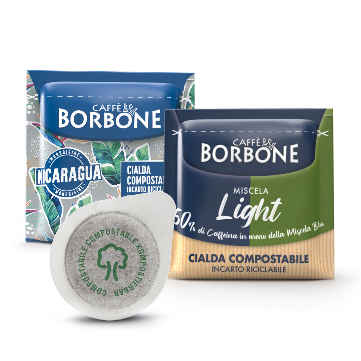 Kit de dégustation de 100 dosettes filtre papier ESE Caffé Borbone dans les nouveaux mélanges Light et Nicaragua, taille 44 mm, 100% compatible avec toutes les machines qui utilisent le système Easy Serving Espresso. Le kit contient 50 dosettes de mélange Light (chaque dosette contient 50 % moins de caféine que le mélange bleu) et 50 dosettes de mélange Nicaragua (café moulu issu d'un mélange de grains sélectionnés du Nicaragua d'origine unique).