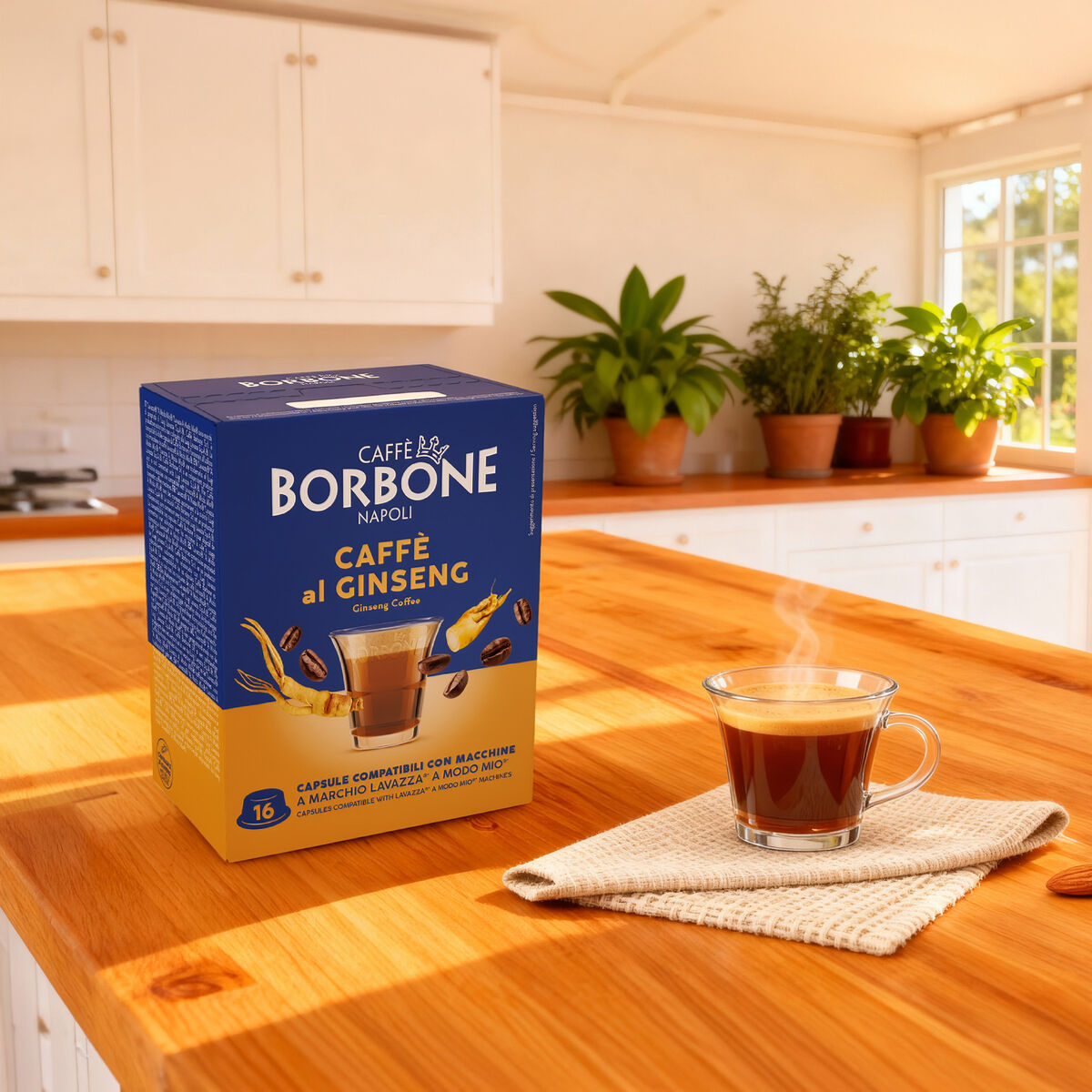 16 Caffè Borbone capsules for a soluble ginseng-flavored drink, compatible with Lavazza®* A Modo Mio®* brand machines.