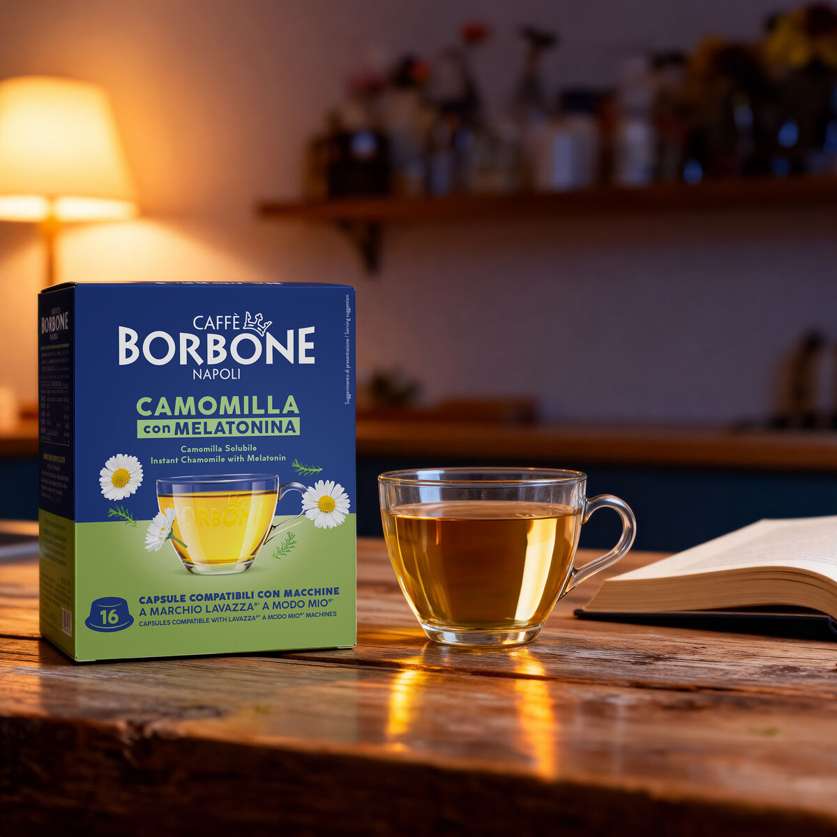 16 Caffè Borbone capsules for Chamomile and melatonin-flavored soluble drink, compatible with Lavazza®* A Modo Mio®* brand machines. Food supplement based on powdered chamomile extract with melatonin.