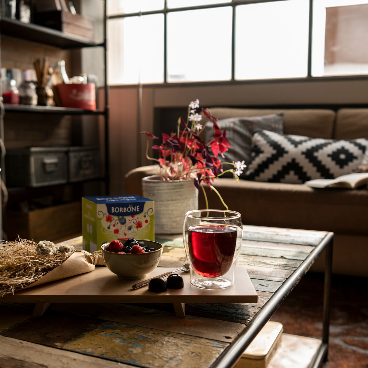 Hibiscus flowers, rose hips, orange and lemon peels, elderberries and blueberries: try the delicate bouquet of flavors of the Borbone berry infusion and treat yourself to a deliciously relaxing break.
