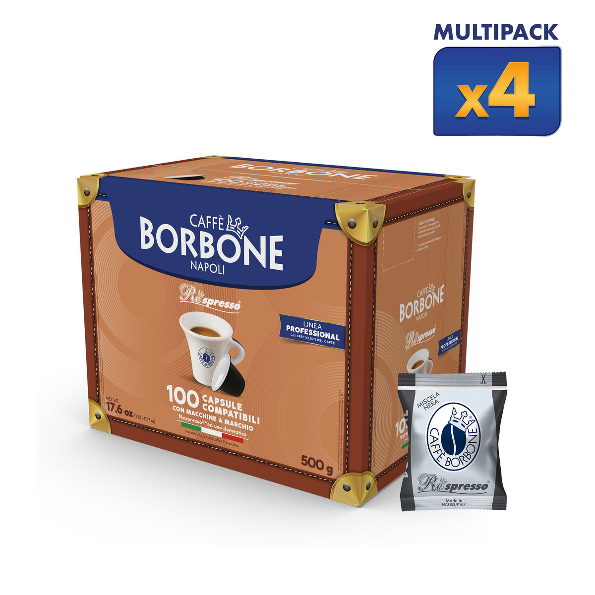 The multipack consists of 4 boxes of 100 each, for a total of 400 Caffè Borbone Capsules Compatible with Nespresso®* Value Pack Black Blend - Strong and Persistent – Intensity 10