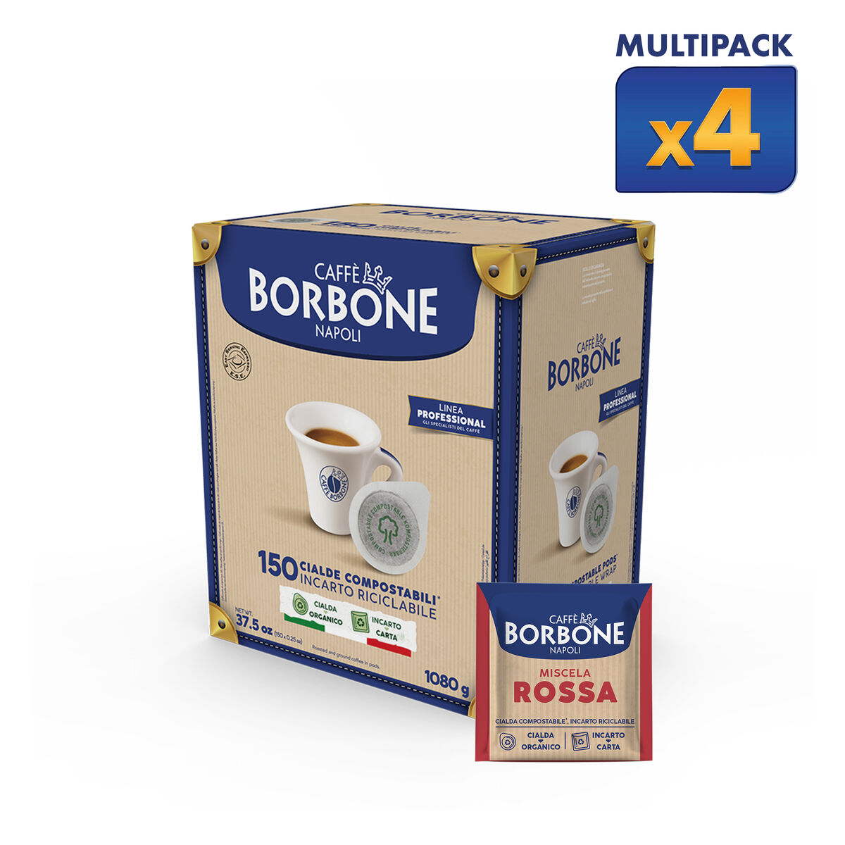 Value Pack: The multipack consists of 4 boxes of 150 each, for a total of 600 Pods Caffè Borbone ESE 44mm COMPOSTABLE - RECYCLABLE PACK.