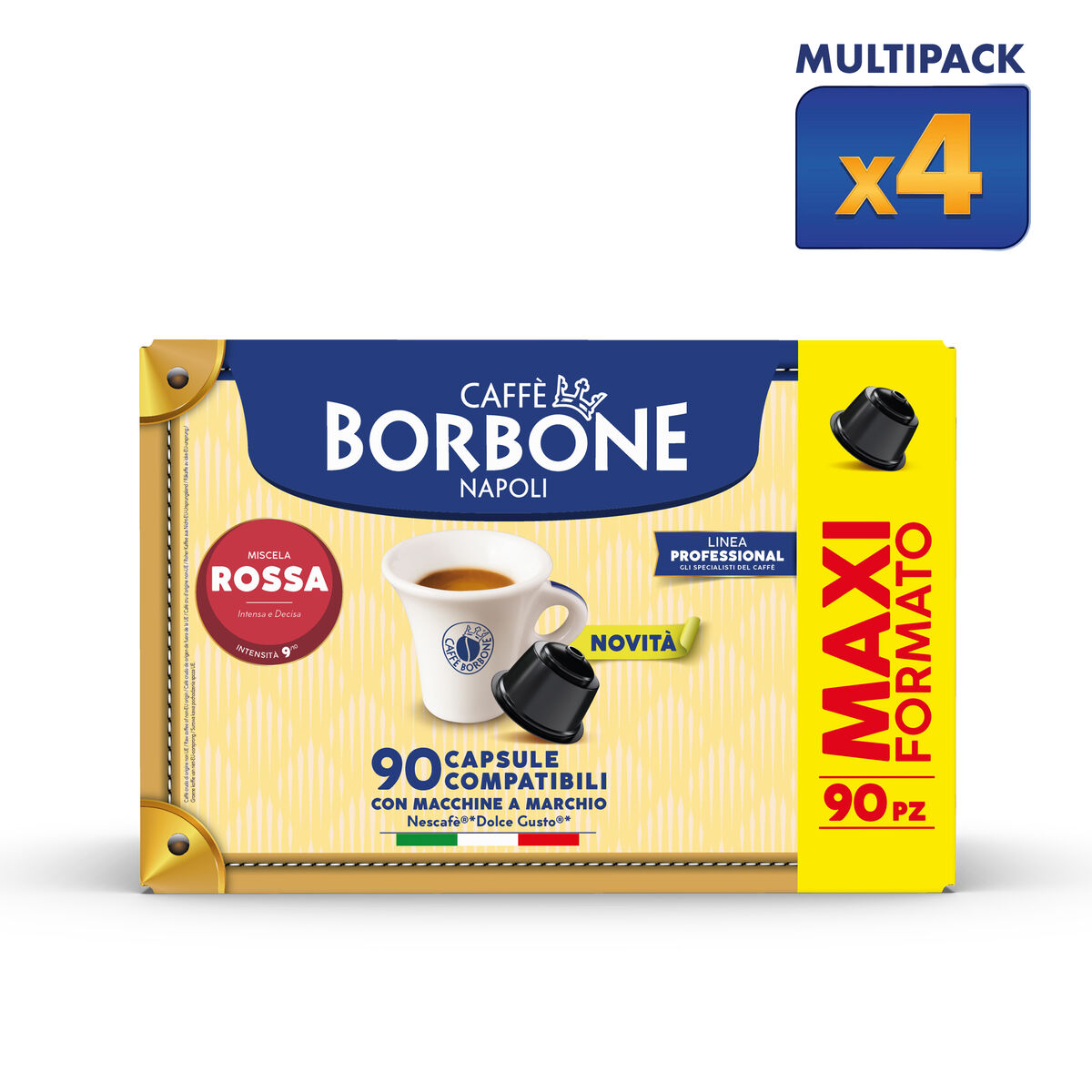 The multipack consists of 4 boxes of 90 each, for a total of 360 Caffè Borbone Capsules Compatible with Nescafè®* Dolce Gusto®* - Value Pack - Red Blend - Intense and Bold - Intensity 9/10
