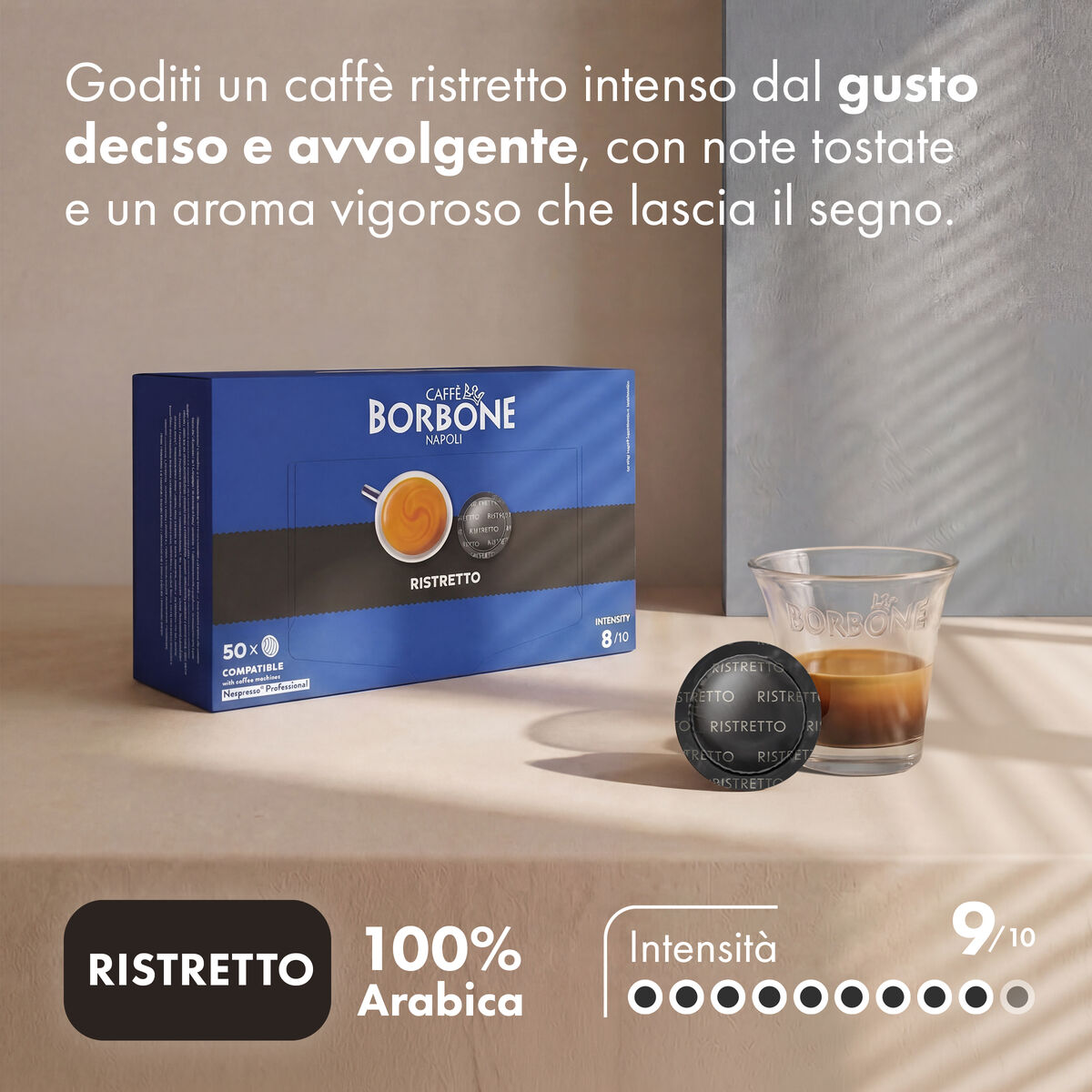 Enjoy an intense ristretto coffee with a bold and enveloping taste, featuring roasted notes and a vigorous aroma that leaves a lasting impression.