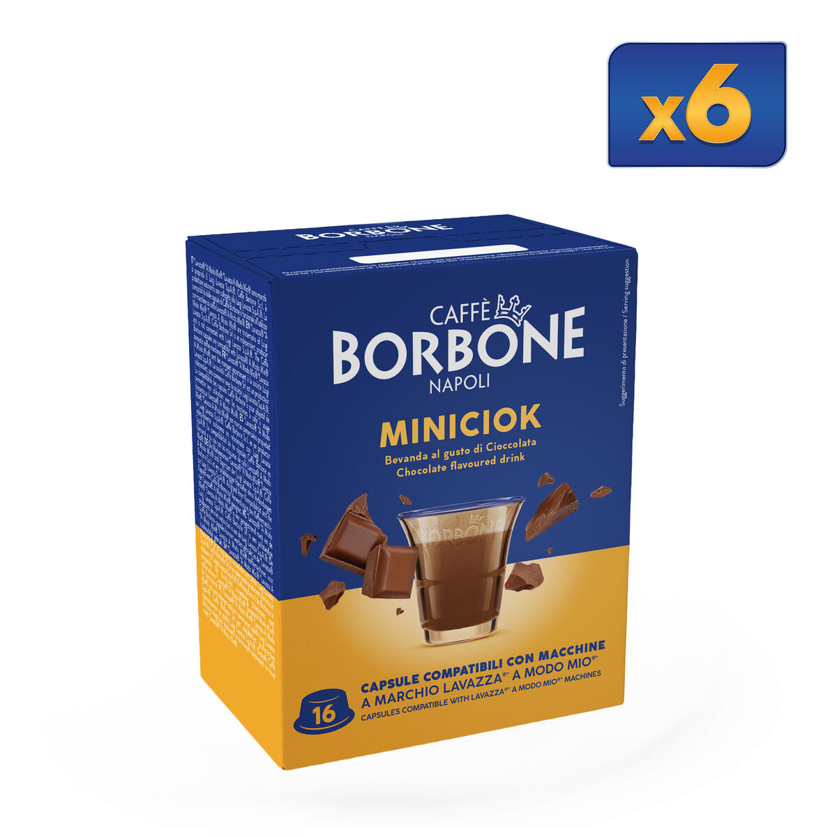 96 Caffè Borbone Miniciock capsules to prepare an exquisite chocolate, compatible with Lavazza®* A Modo Mio®* brand machines.