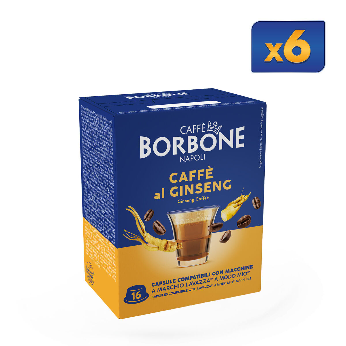 96 Caffè Borbone capsules for a soluble ginseng-flavored drink, compatible with Lavazza®* A Modo Mio®* brand machines.