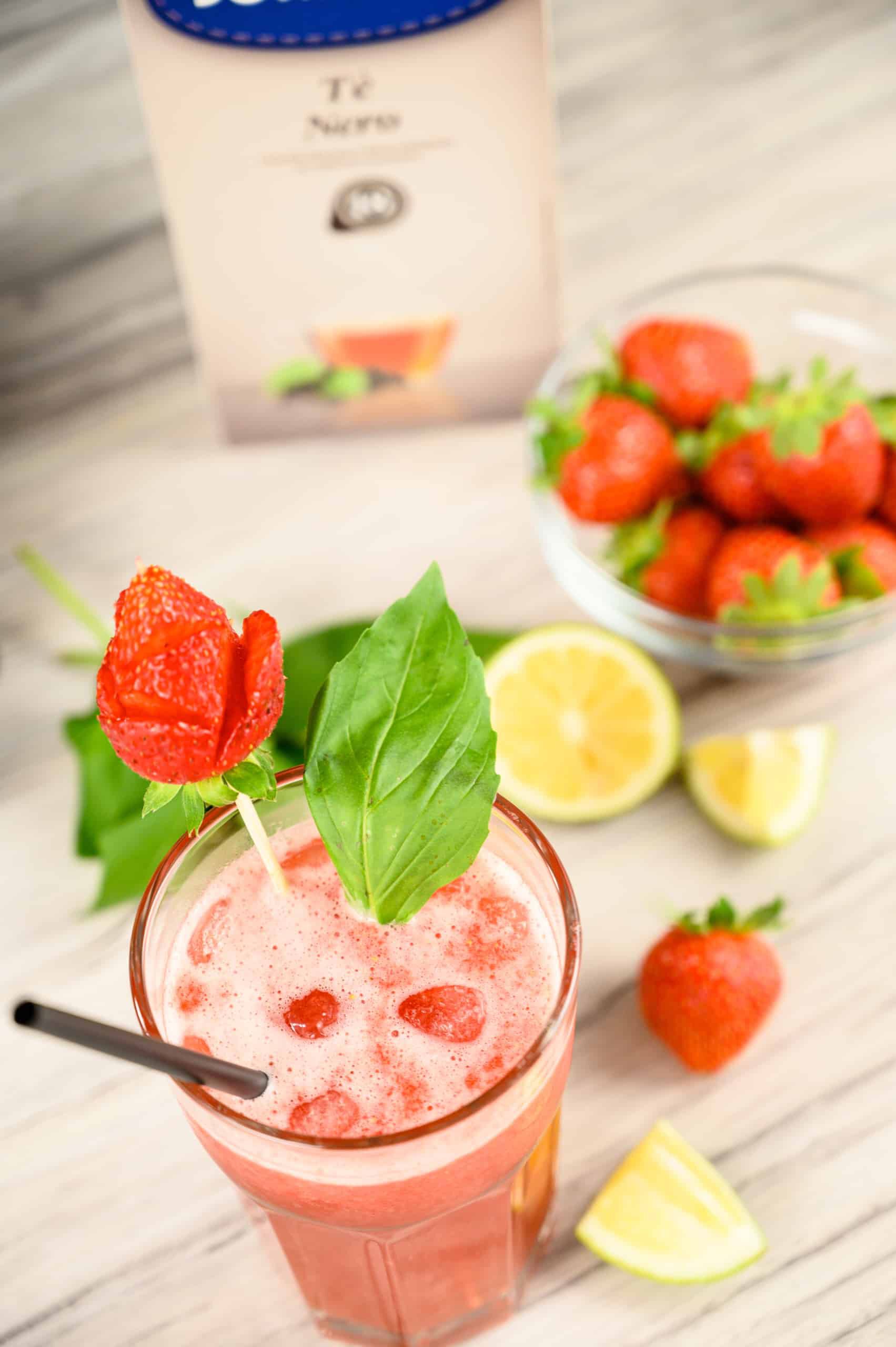 È davvero una ricetta gustosa e profumata, leggermente più densa rispetto alla consueta bibita al tè, grazie alla presenza di fragole frullate, che oltretutto addolciscono il sapore del tè nero.