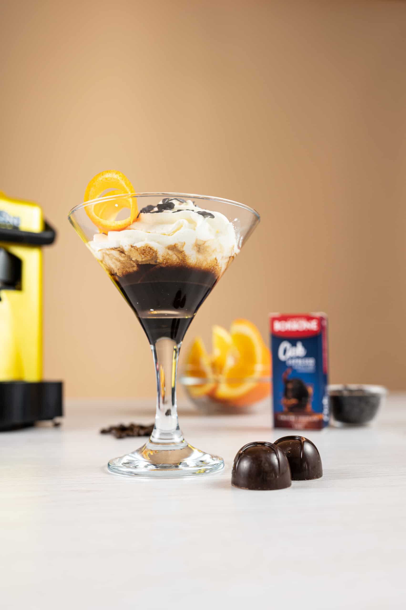 All'interno c'è, infatti, uno strato di cioccolato fondente che è aromatizzato dalle note fresche e agrumate delle scorzette d'arancia. Il caffè caldo va ad armonizzare profumi e sapori e per rendere la ricetta davvero speciale: un'abbondante spruzzata di panna montata e scaglie di cioccolato.
