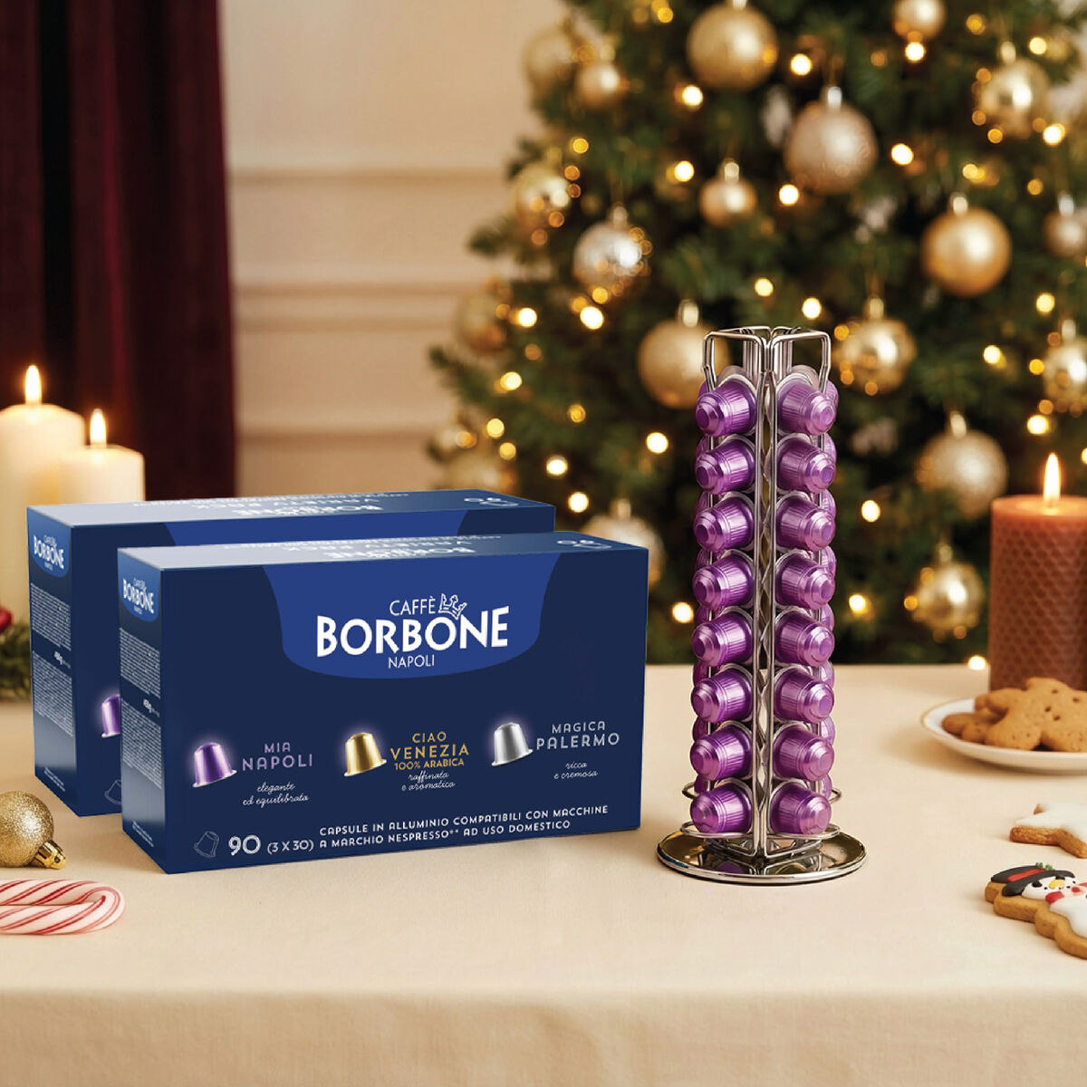 All the goodness of Caffè Borbone in aluminum capsules in a convenient 180-cap supply format with an elegant capsule holder.