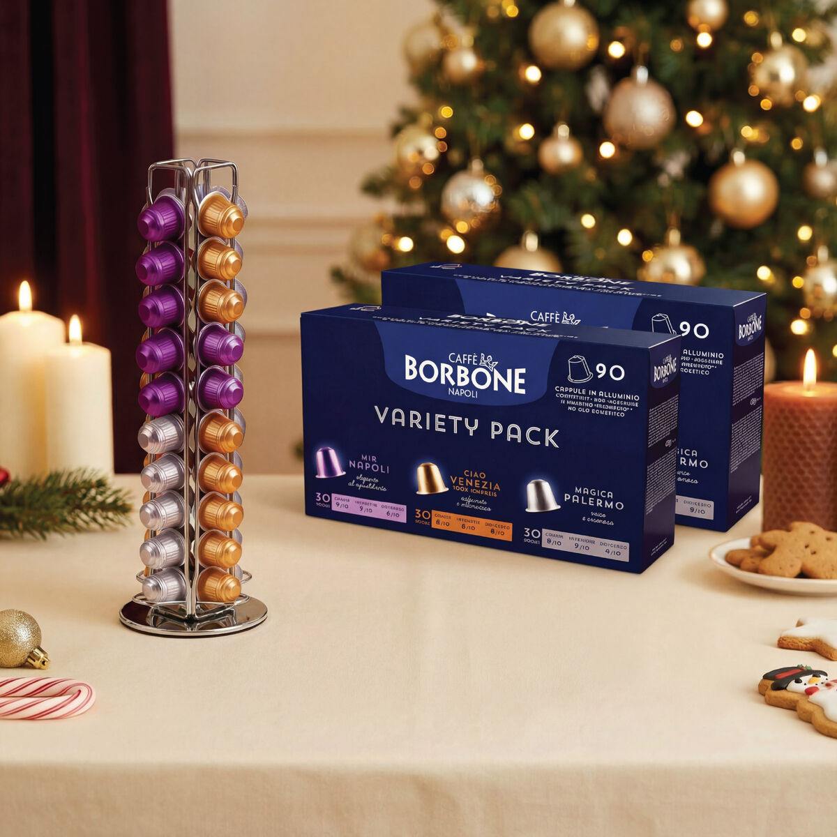 All the goodness of Caffè Borbone in aluminum capsules in a 180-cap tasting kit and an elegant capsule holder.