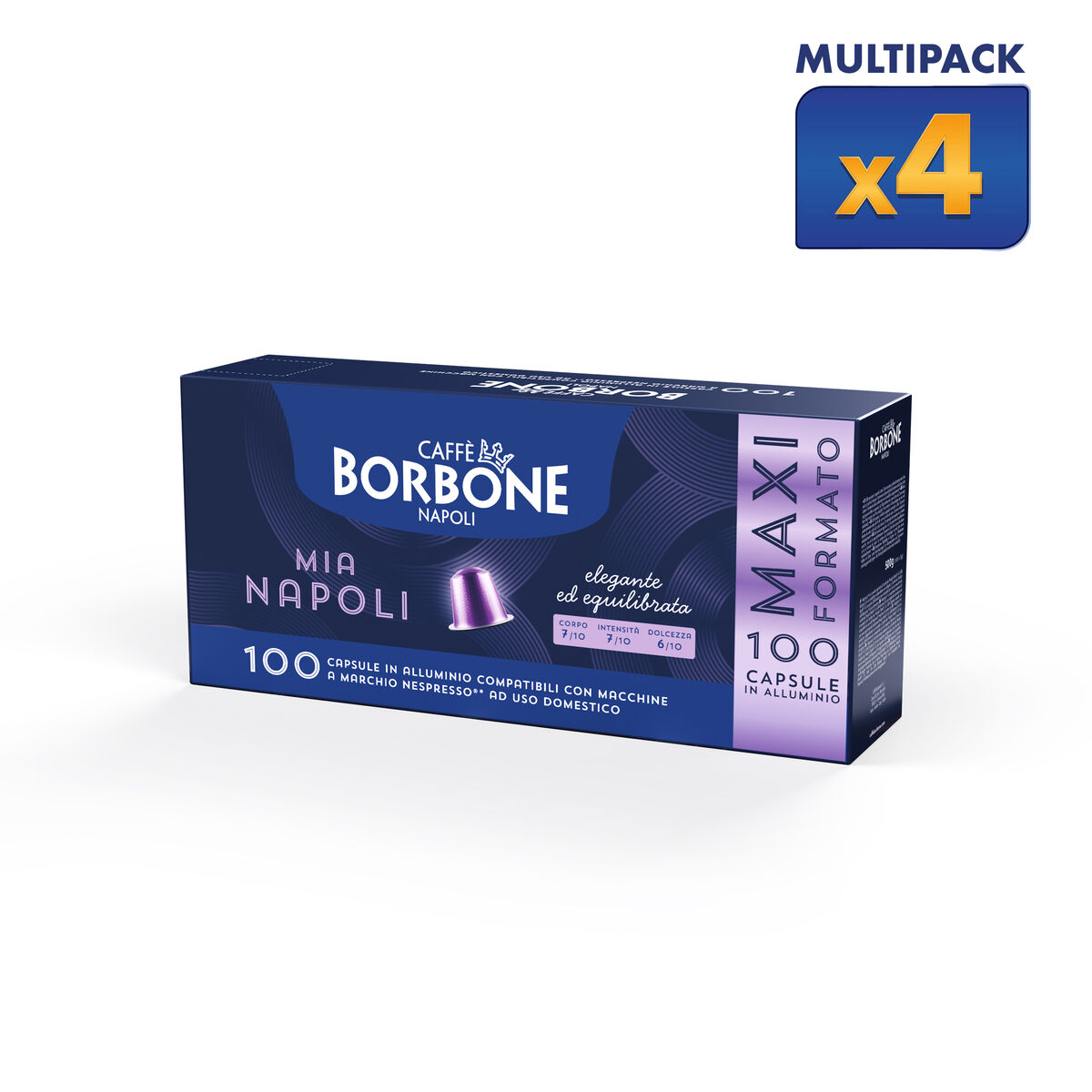 Il multipacco è composto da 4 scatole da 100 per un totale di 400 Capsule in alluminio Caffè Borbone compatibili Nespresso®* Mia Napoli Miscela ORO - Formato convenienza – Elegante ed Equilibrata – Intensità 7/10